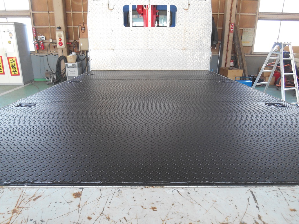 荷台の損傷が激しくなったため、縞鋼板 SS400 t=2.3 を施工。荷台上は滑りやすく転倒防止対策に効果を発揮します。