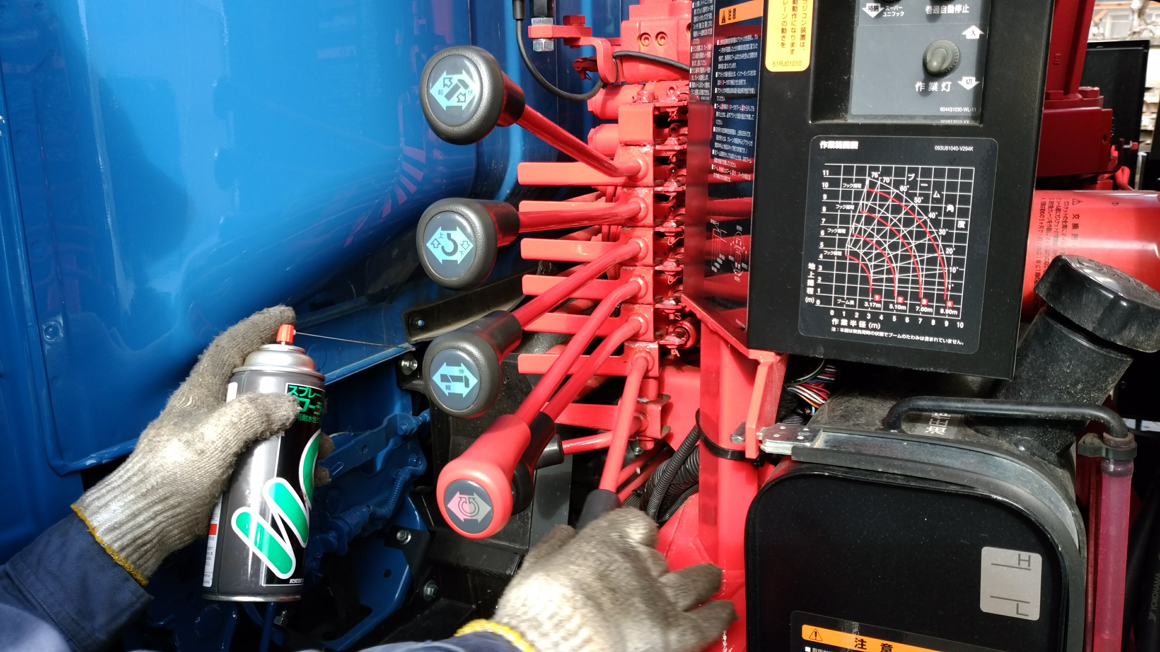コントロールバルブ。各操作レバーの操作具合、油漏れ、リリーフ弁の設定圧等の点検及びグリスアップ。