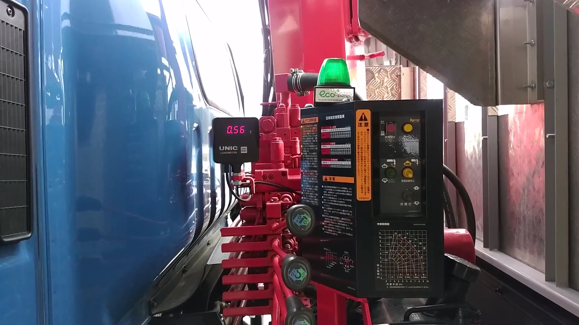 標準仕様でデジタル式荷重計が付いています。画像は0.56tを表示していますが、吊り荷を動かすと数値も変動して表示されます。リアルタイムで把握できるようになっており、表示単位は20kg毎です。